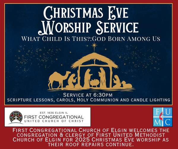 This Christmas Eve, First UMC Elgin is delighted to announce that we will join our friends at First Congregational Church of Elgin at 6:30 pm for a special, shared worship service!