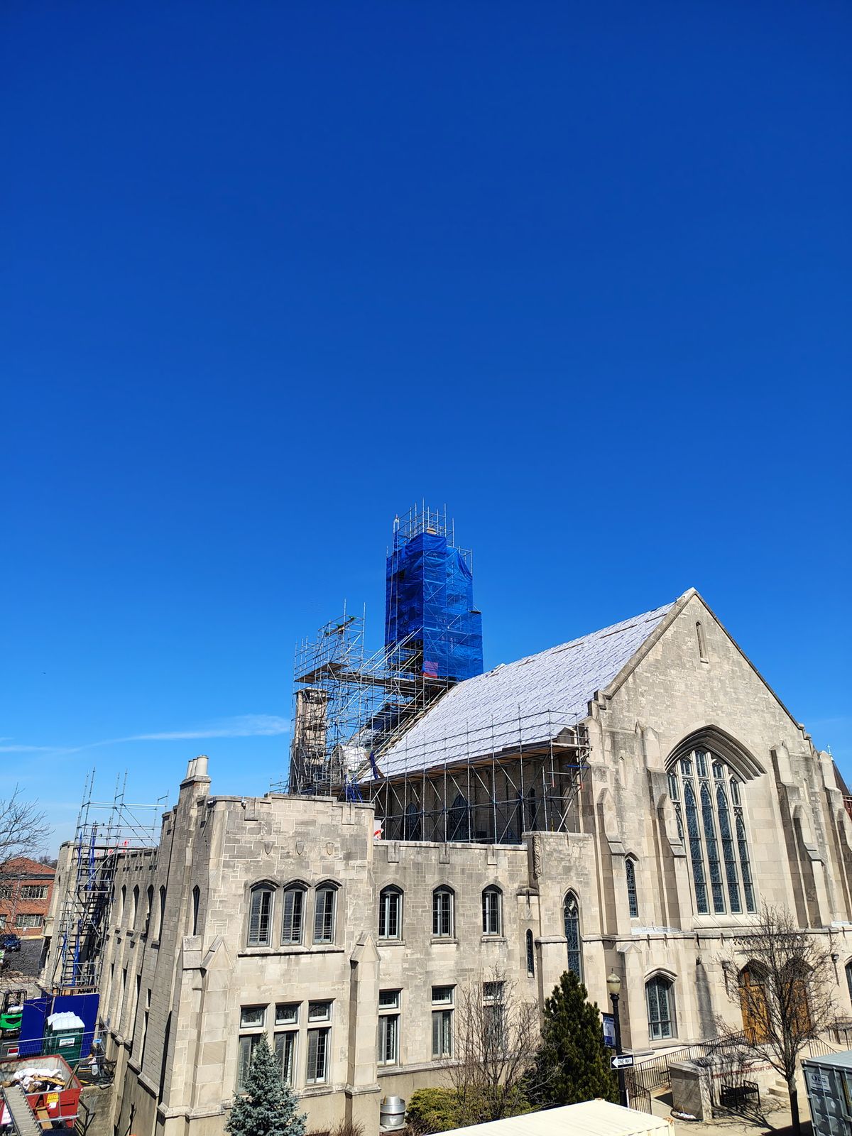 04.22.25 Update: Rebuilding efforts are moving forward! This Monday, scaffolding in the Sanctuary reached the ceiling, and new catwalks now provide our contractors with safe access to the attics. This allows for a thorough inspection of the wooden beam ceiling for any damage caused by debris and water. We've also successfully removed all the red carpet and opened several walls to investigate potential water damage. Good news on the east side stairwell: it has been shored up, and repairs are currently underway to address the damage it sustained from falling masonry. While we continue our mitigation and drying processes, we are working closely with the insurance company to ensure the rebuild progresses smoothly.
